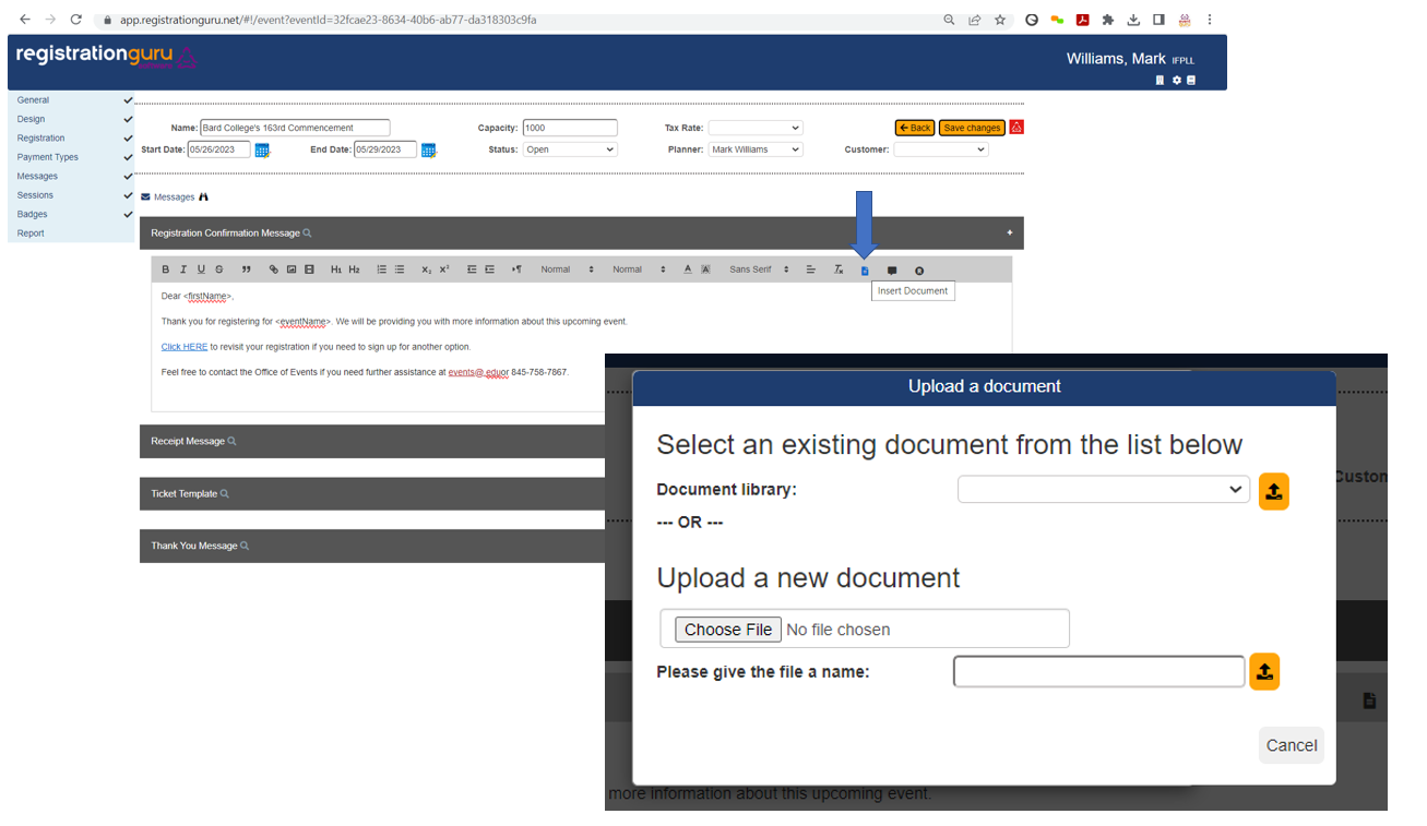 Need to attach a document to a communication? In the communications section, click on the Insert Document icon from the editor tool box and pick between selecting from the document library drop down or uploading a document from your file. Documents that are useful to have stored in the library include maps, parking information, directions, and other common information you would share with a visitor.